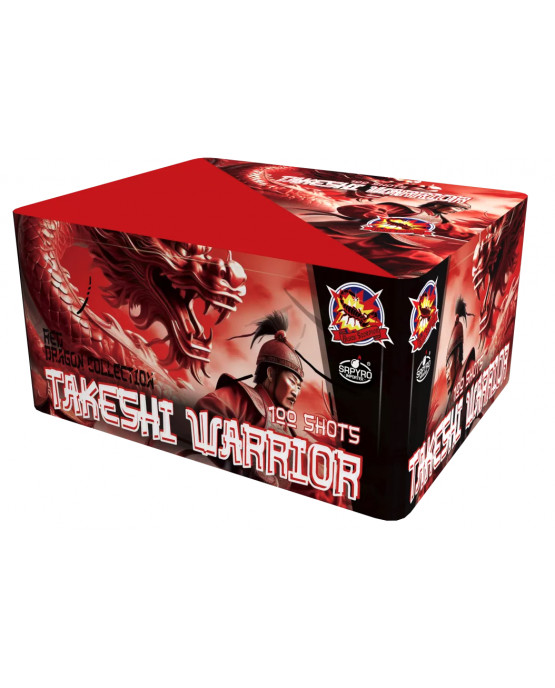 Kompaktní ohňostroj Takeshi Warrior je doprovázený brokáty s barevnými konci a bílým gliteringem zakončený stříbrným craclingem. Do vzduchu vypálí 100 ran ráže 20 mm, celá show trvá 70 vteřin.Směr výmetu je rovno vzhůru a do stran. Min.vzdálenost diváků od setu je 30m.Kategorie F3-prodej od 21let.